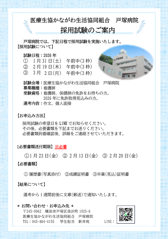 戸塚病院では、26卒学生の採用試験を継続して募集を行っています!
